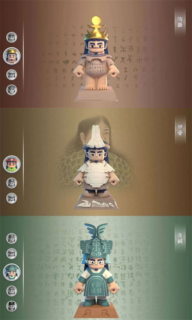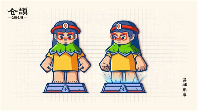 IP形象是以傳說中創造漢字的倉頡為創意原型,通過對其造型的系列化結構設計與涂裝,體現漢字書體與對應工具材料呈現載體的發展變化歷程,以及與之同時期的服飾與裝飾藝術特征。包括小倉頡主形象和穿越于不同漢字發展時代九個不同的形象設計,表現十種代表性書體與其相應的工具材料載體,體現了漢字發展與科技進步的緊密關系。
