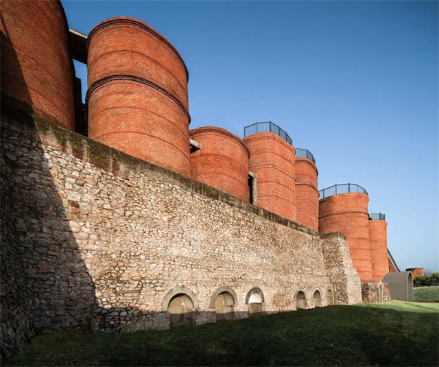 為了突出舊石灰窯,設計師刻意弱化博物館的形態(tài)及色彩,將其“藏匿”于舊石灰窯的背后,并將部分展示空間“壓”入地下,使得博物館的高度低于舊石灰窯。