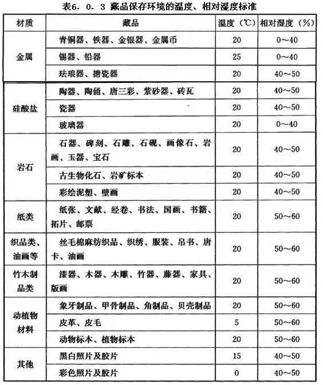 3、設置空氣調節設備的藏品庫房、展廳,其溫度和相對濕度應保持穩定,溫度日較差應控制在2℃~5℃范圍,相對濕度日波動值不應高于5%,且應根據藏品材質類別確定。藏品保存環境的溫度、相對濕度標準可按表6.0.3確定,并應滿足工藝要求。