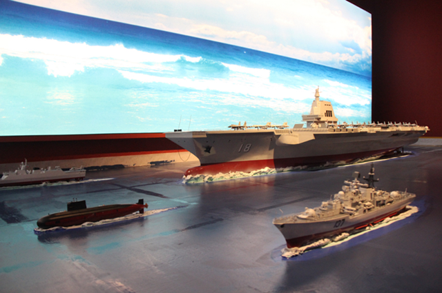 在二層的“自強之道——船政歷史文化陳列”中,大量運用了場景還原的方法,生動講述船政歷史。大型沙盤再現了船政十三廠熱火朝天的生產場景;微縮模型生動呈現了艦船制造的全過程;大型雕塑、模型還原了“左宗棠三顧宮巷”的場景、船政學堂教學場景、馬江海戰將士“艦雖亡,旗還在”的英勇精神等。記者看到,“福建艦”1∶100比例的模型攜帶著寧德艦等以福建城市命名的軍艦,一同亮相博物館。