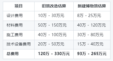 從以上對比可以看出,舊館改造的最低估算費用為120萬元,而新建博物館的最低估算費用為93萬元,二者之間的差距在27萬元左右。在最高估算中,舊館改造的費用高達330萬元,而新建博物館的最高估算為265萬元,二者的差距為65萬元。