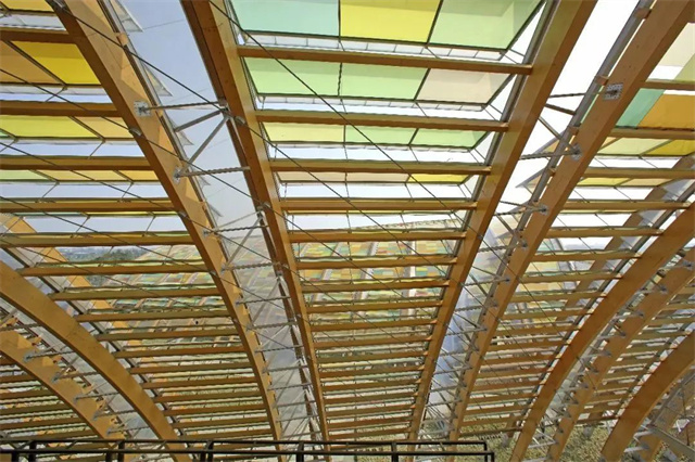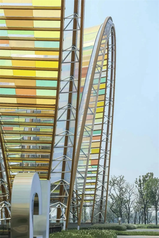 建筑選用了負碳材料膠合木作為棚架的主要結(jié)構(gòu)材料,輕質(zhì)炫彩的ETFE膜材作為主要圍護材料,這兩者的融合運用為天府大地增色添彩。